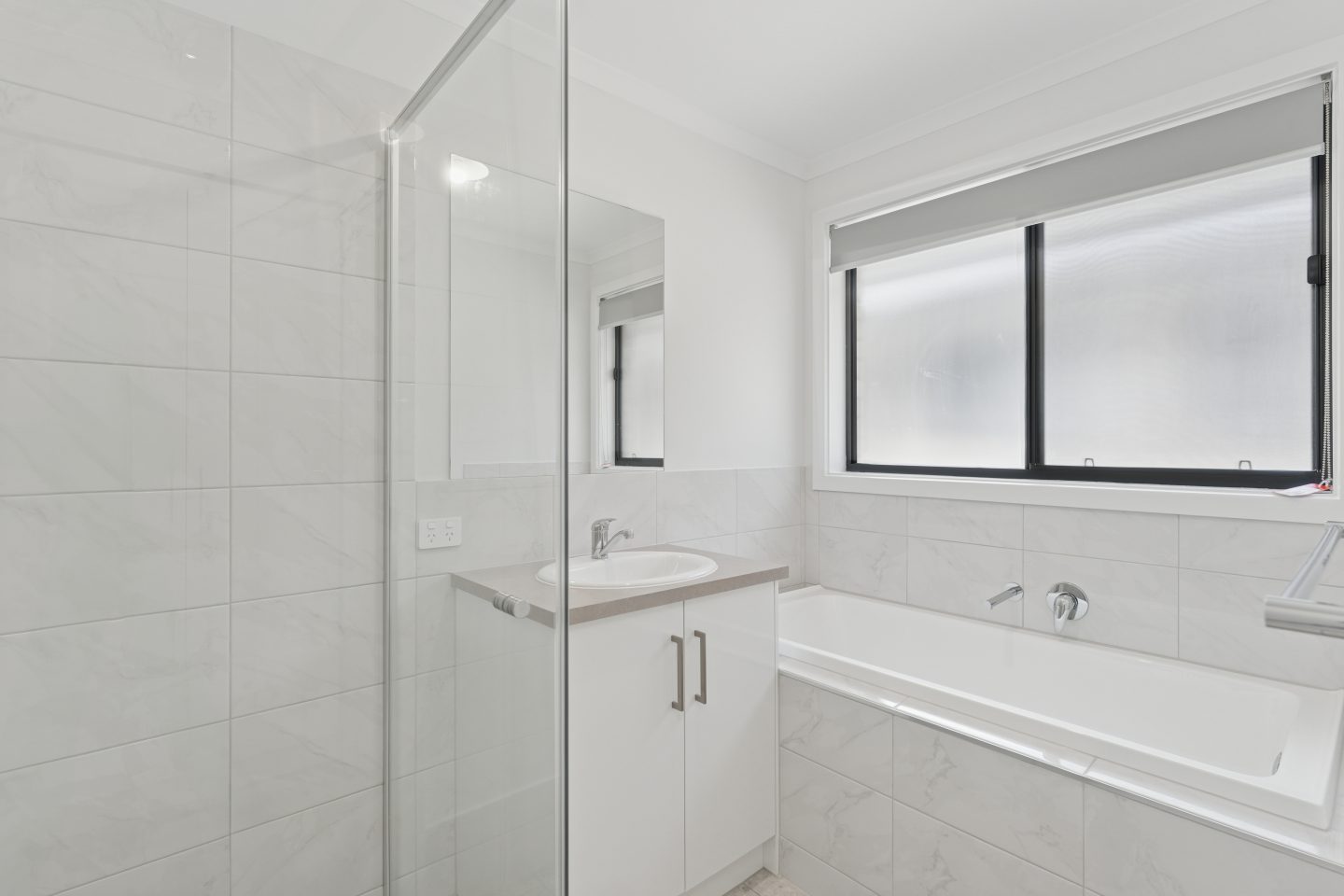 • Stylish main bathroom with full-sized bathtub, modern vanity, and marble-look tiling