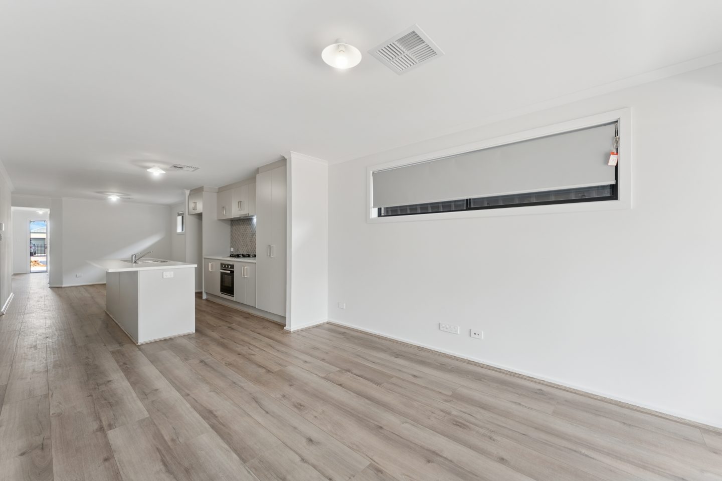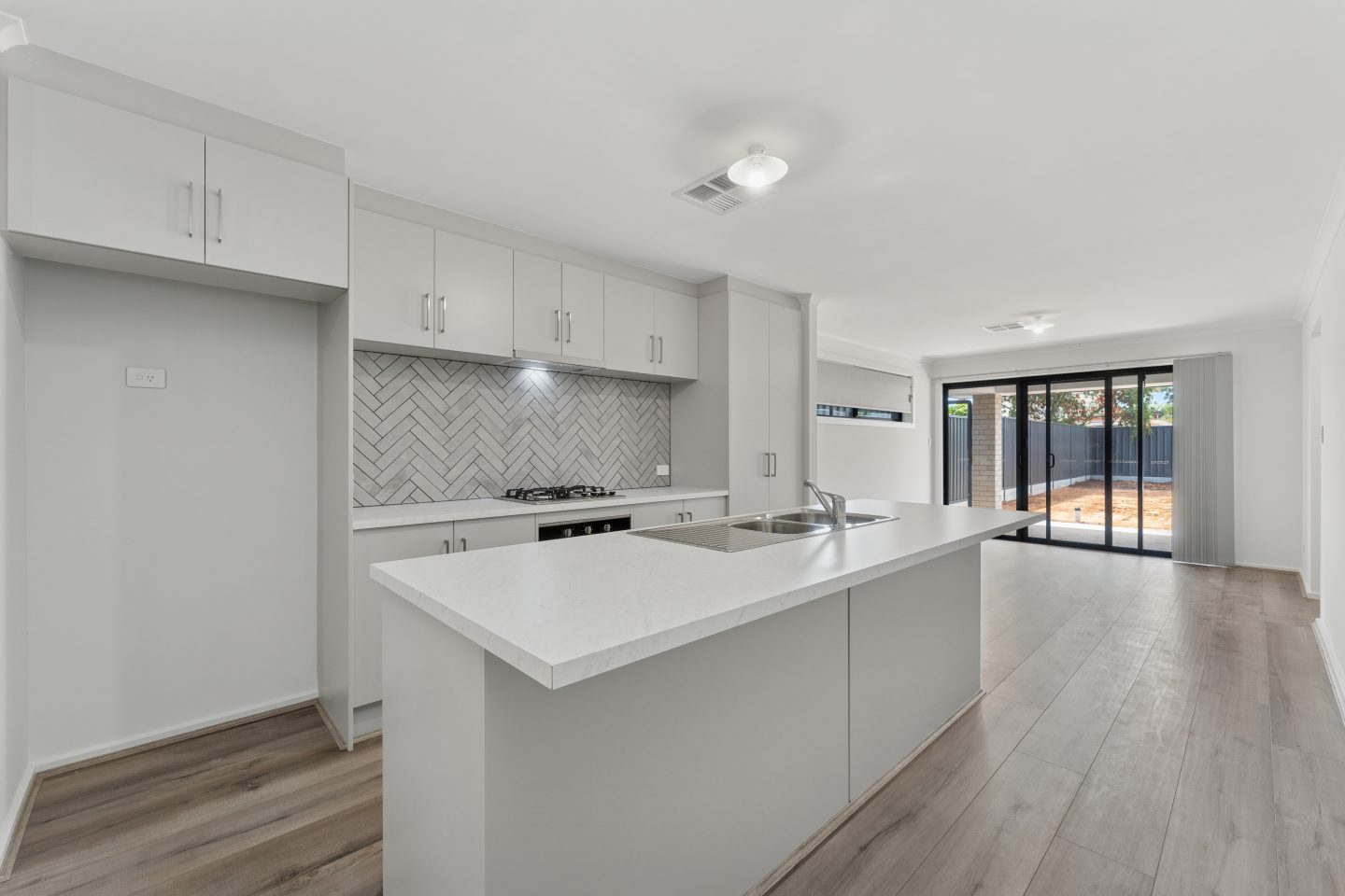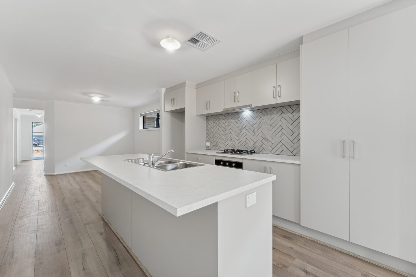 • Open-plan kitchen and dining with central island, gas cooktop, herringbone splashback, and stainless-steel appliances
