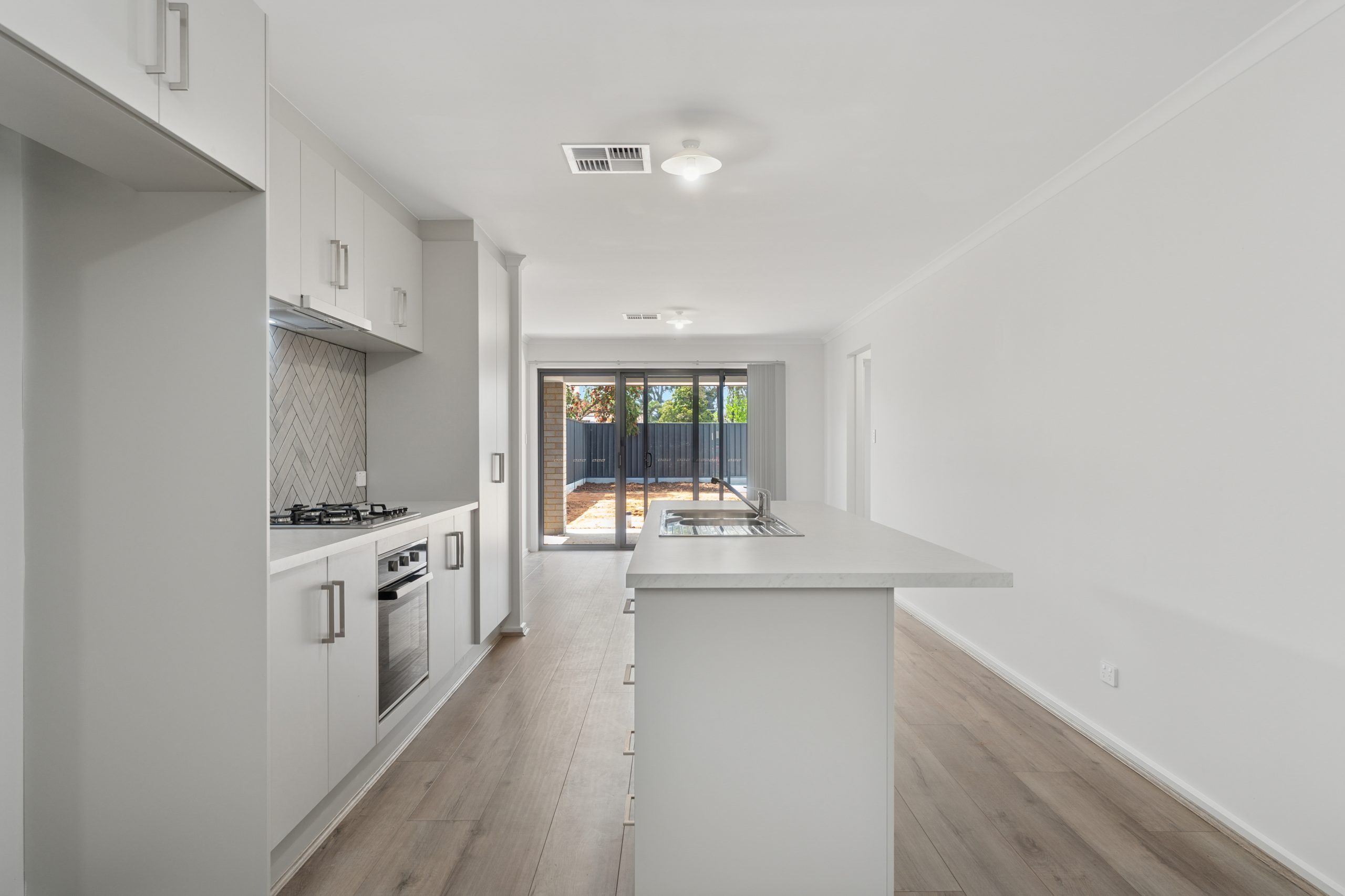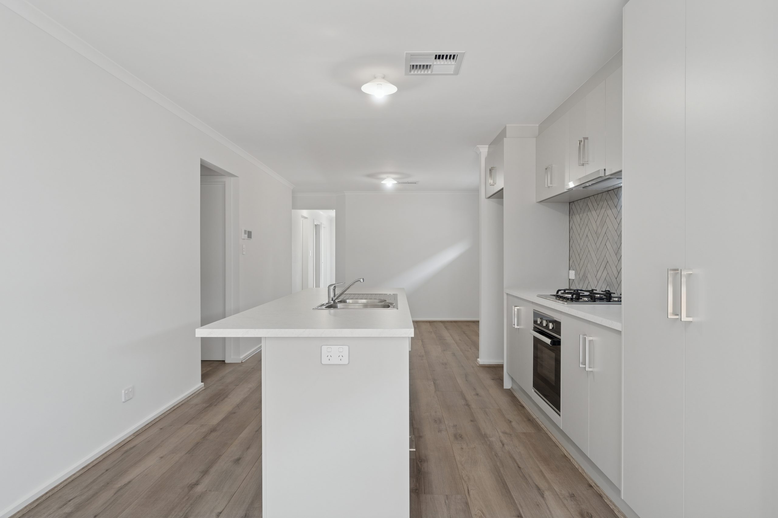 • Open-plan kitchen and dining with central island, gas cooktop, herringbone splashback, and stainless-steel appliances